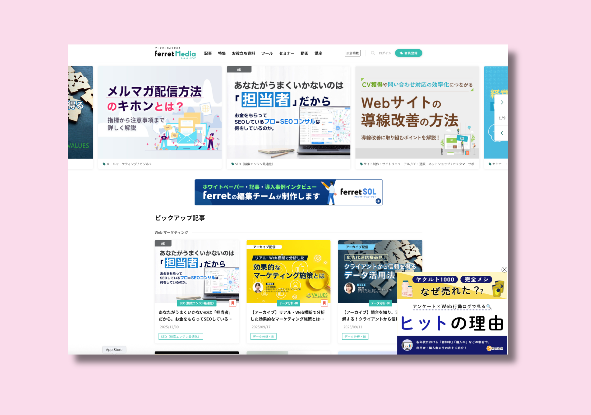 ferretの成功の秘訣は、検索エンジンだけに頼らない多様な流入経路を確保していることです。SEO、SNS、メールマガジン、お気に入りからの直接訪問など、複数の入口を用意しています。